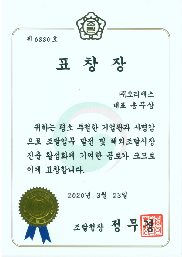 수상 2020년 조달청장 표창 페이지 정보 작성자 OTS 조회조회 108회 작성일작성일 25-12-23 18:38 본문 2020년 조달청장 표창 목록 이전글2019년도 IR52 장영실상 수상 다음글2021년 대전시 스타기업 선정패