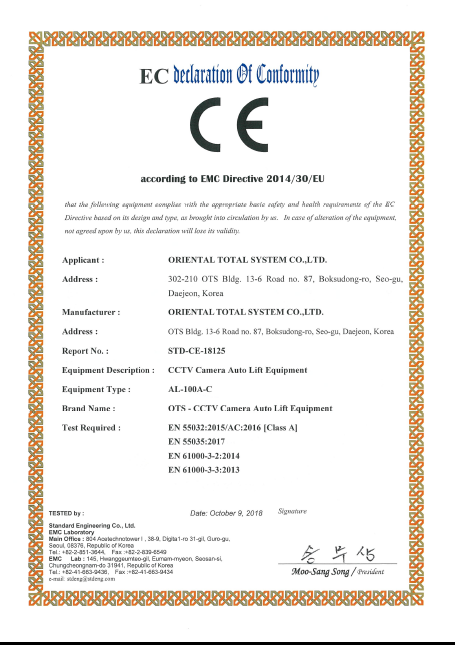 인증 CE 인증서 페이지 정보 작성자 OTS 조회조회 120회 작성일작성일 25-12-23 18:41 본문 CE 인증서 목록 이전글2021년도 대전광역시 유망중소기업 지정 인증서 다음글NRTL 인증서