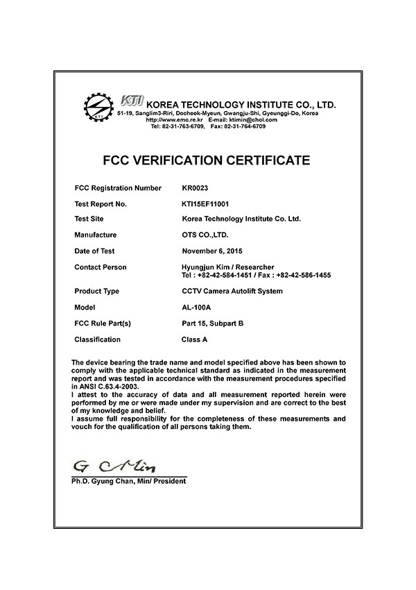 FCC认证书(CCTV Camera Autolift System)