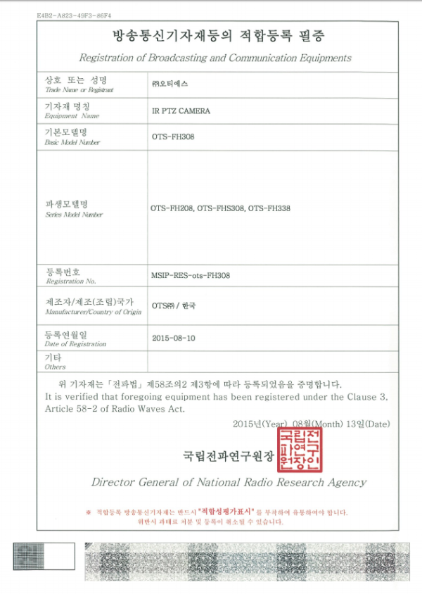 认证 摄像机-KC认证书(OTS-FH308) 页面信息 作者 OTS 浏览浏览 104次 发布日期发布日期 25-12-23 18:35 正文 摄像机-KC认证书(OTS-FH308) 列表 上一篇NVR-KC认证书(FNR-64) 下一篇摄像机-KC认证书(OTS-NPC6370R)