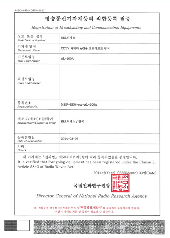 Certifications KC Certificate: AL-100 Page Information Author OTS Views Views 75 Date Posted on 25-12-23 18:34 본문 KC Certificate: AL-100 검색 List PrevKC Certification for Camera (OTS-NPC6370R) NextFCC Certificate (CCTV Camera Autolift System)