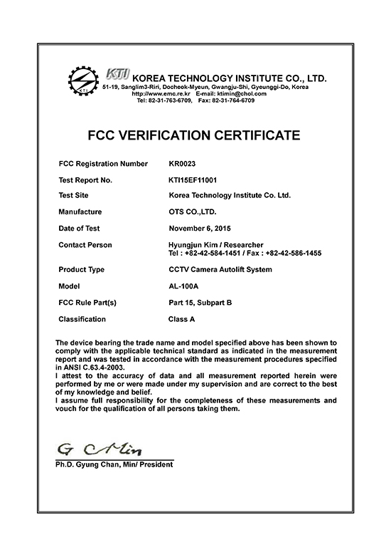 인증 FCC 인증서(CCTV Camera Autolift System) 페이지 정보 작성자 OTS 조회조회 170회 작성일작성일 25-12-23 18:34 본문 FCC 인증서(CCTV Camera Autolift System) 목록 이전글KC인증서(AL-100) 다음글기업부설연구소인증서