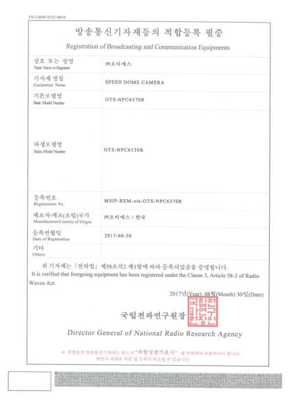인증 카메라-KC인증서(OTS-NPC6370R) 페이지 정보 작성자 OTS 조회조회 159회 작성일작성일 26-02-27 09:44 본문 카메라-KC인증서(OTS-NPC6370R) 검색 목록 이전글카메라-KC인증서(OTS-FH308) 다음글KC인증서(AL-100)