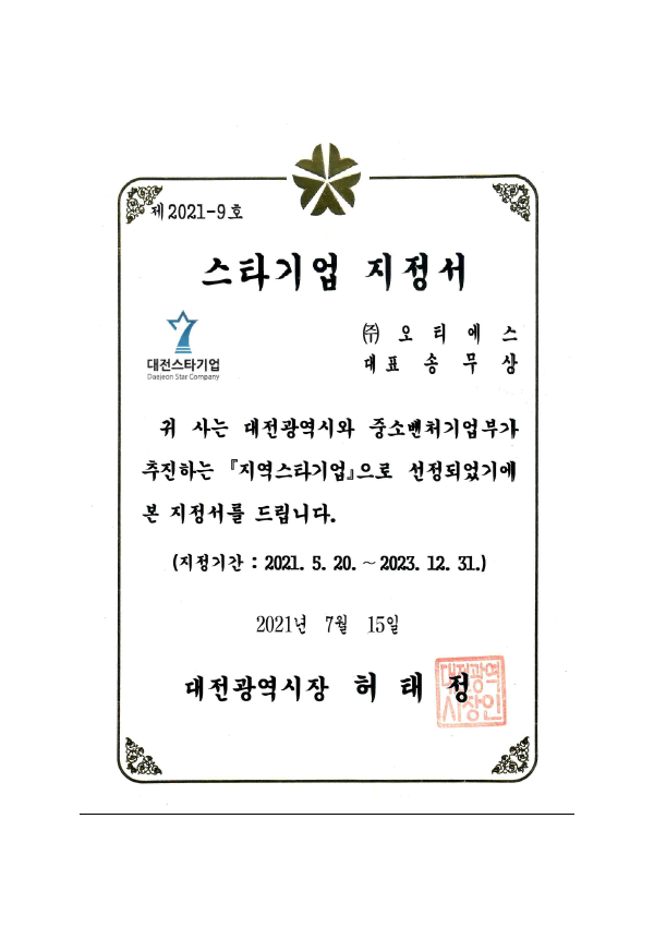 2021年 大田広域市 スター企業 選定 (認定証 受領)